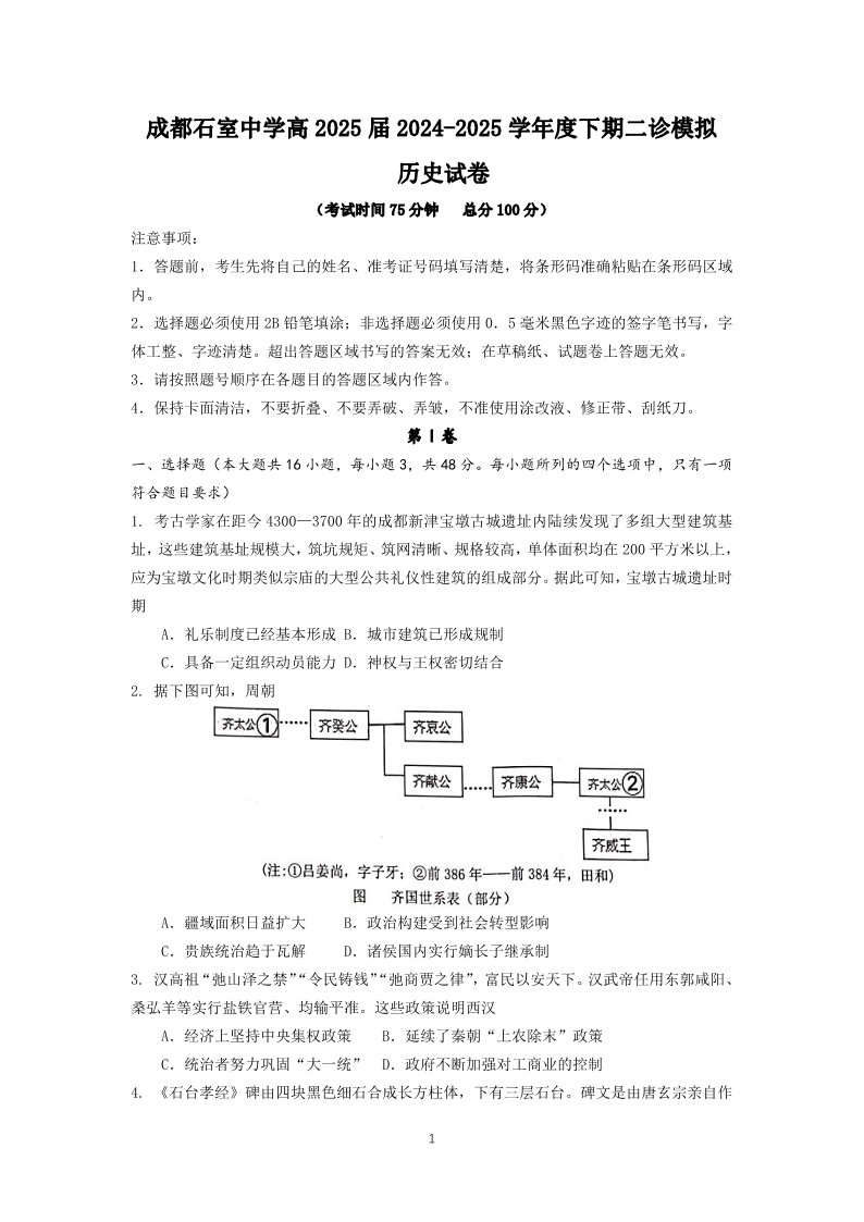 四川省成都石室中学2025届高三下期二诊模拟考试历史