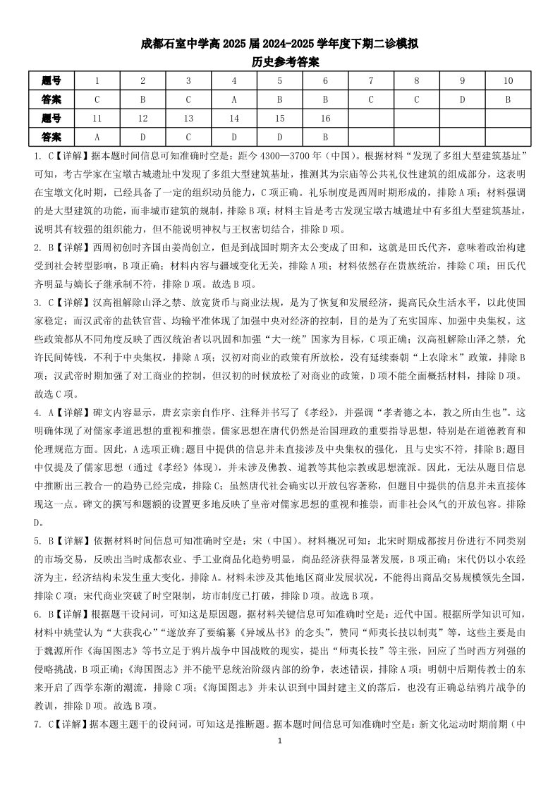 四川省成都石室中学2025届高三下期二诊模拟考试历史答案