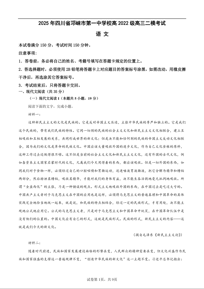 四川省成都市邛崃市第一中学校2025届高三下学期二模考试语文
