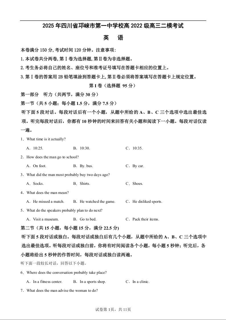 四川省成都市邛崃市第一中学校2025届高三下学期二模考试英语+答案