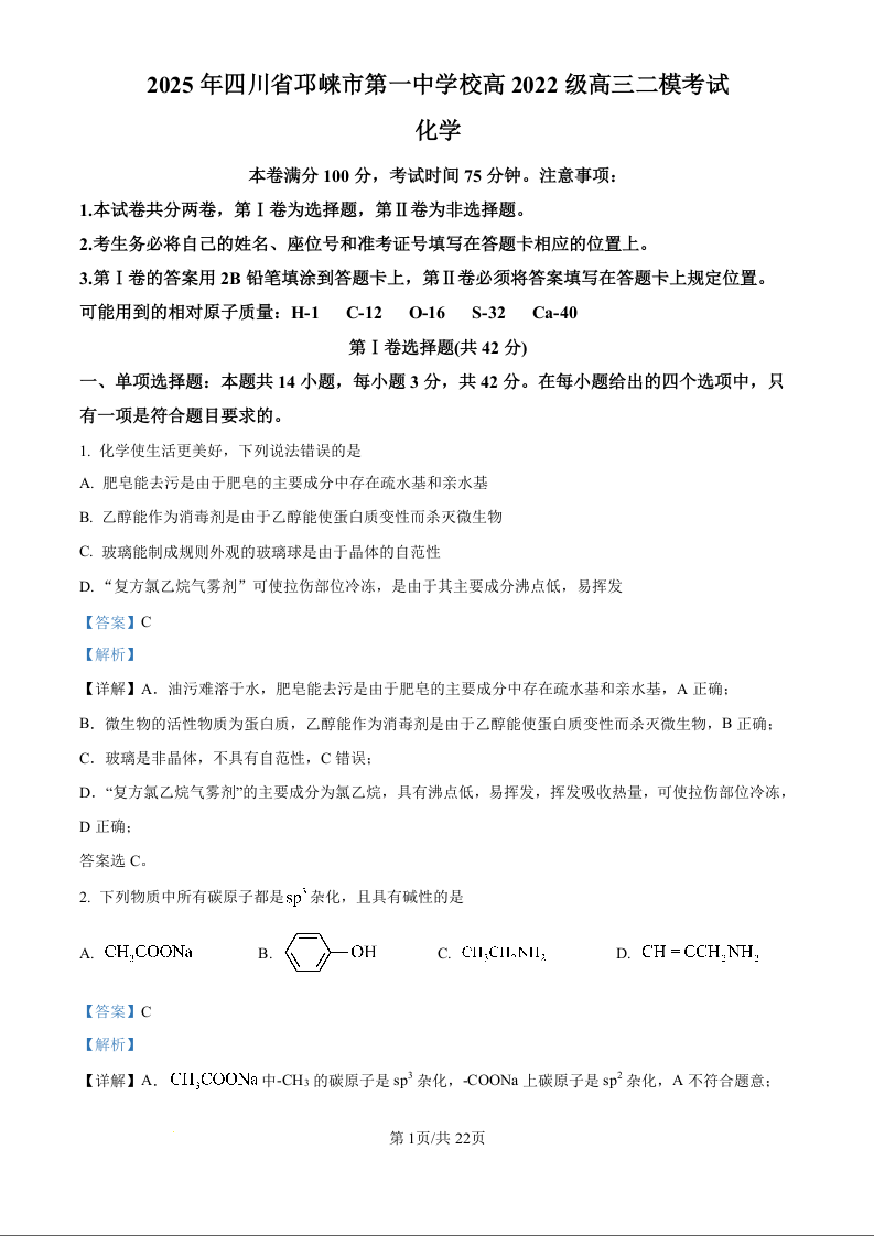 四川省成都市邛崃市第一中学校2025届高三下学期二模考试化学(精品解析版)
