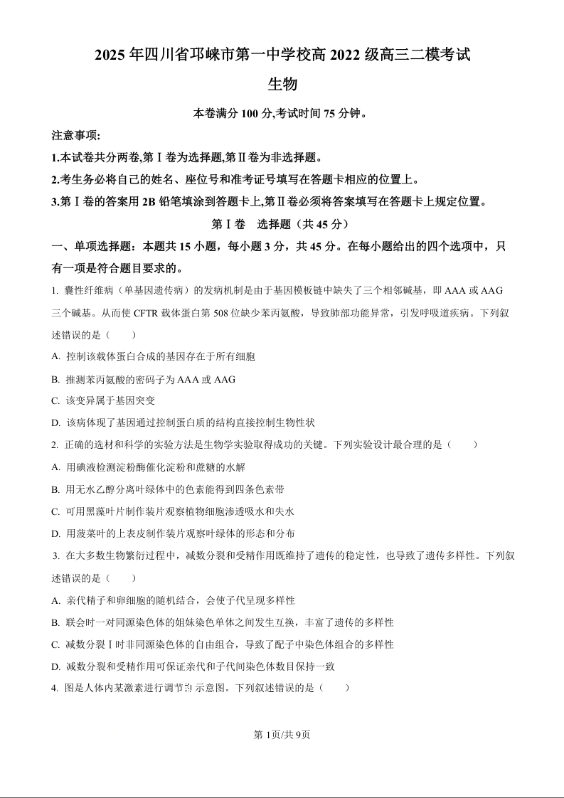 四川省成都市邛崃市第一中学校2025届高三下学期二模考试生物(原卷版)