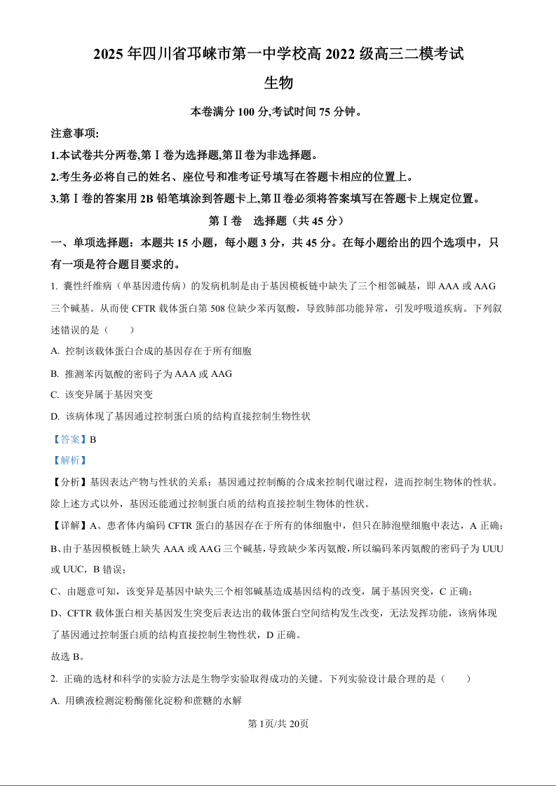 四川省成都市邛崃市第一中学校2025届高三下学期二模考试生物(精品解析版)