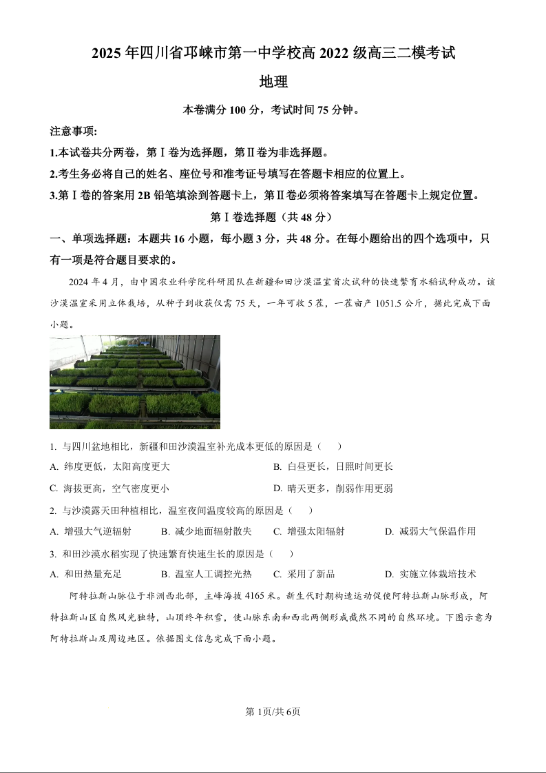 四川省成都市邛崃市第一中学校2025届高三下学期二模考试地理(原卷版)