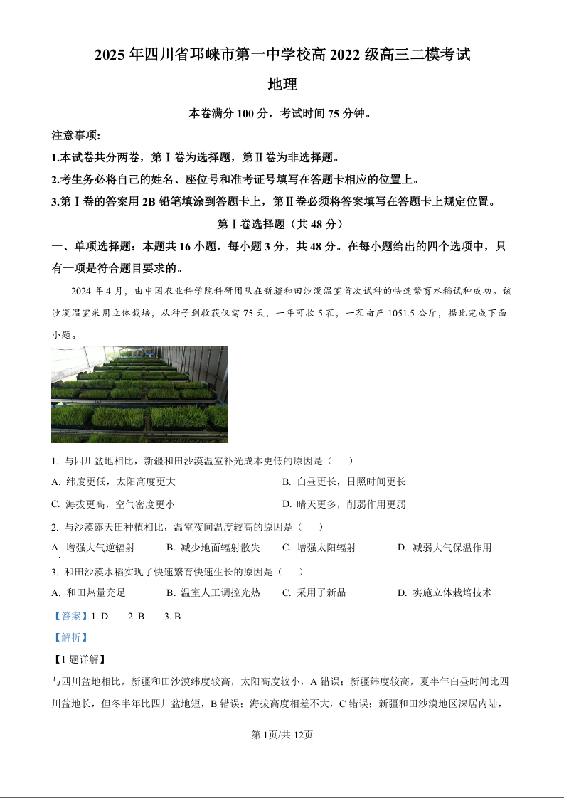 四川省成都市邛崃市第一中学校2025届高三下学期二模考试地理(精品解析版)