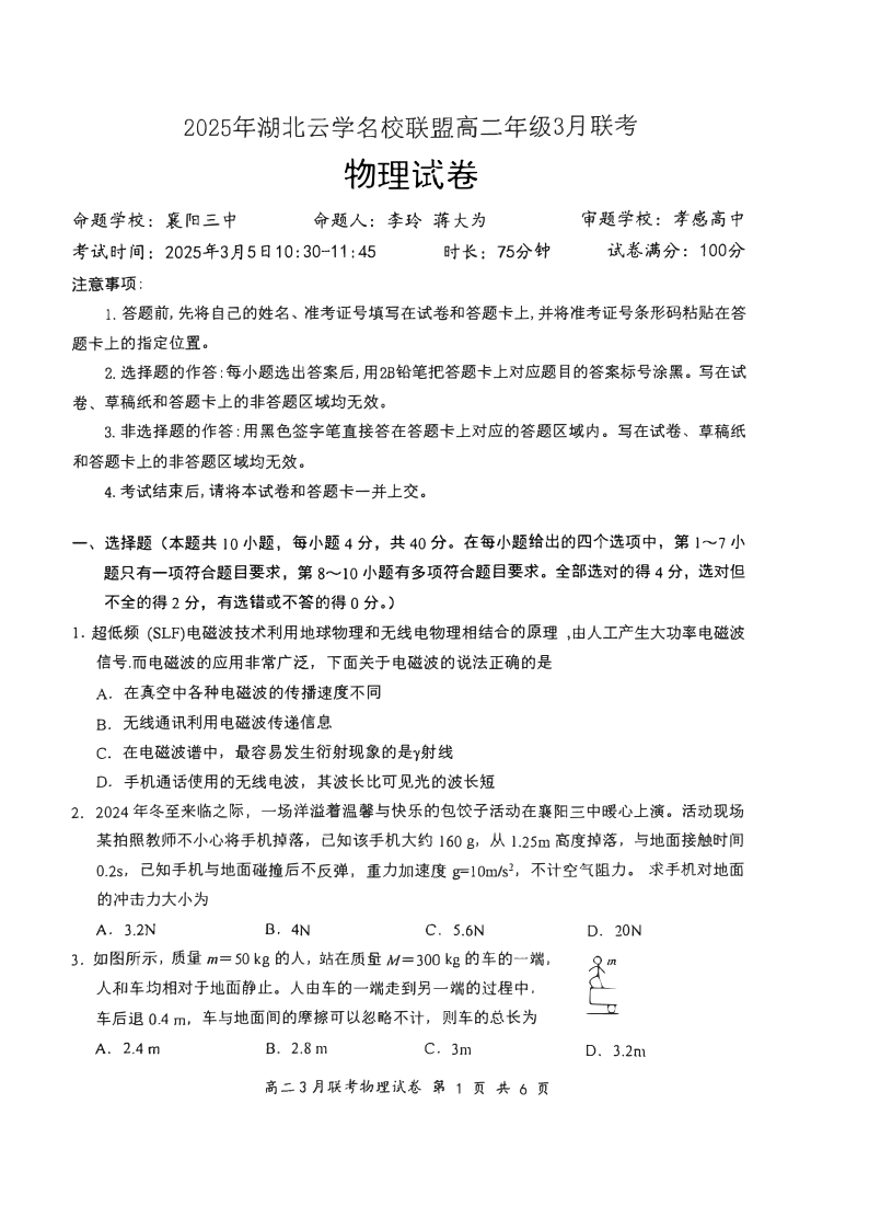 湖北省云学名校联盟2024-2025学年下学期3月高二联考物理