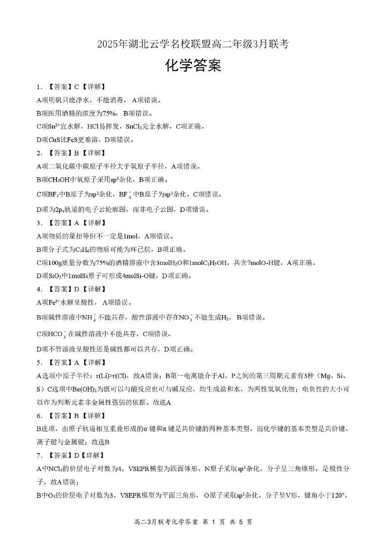 湖北省云学名校联盟2024-2025学年下学期3月高二联考化学答案