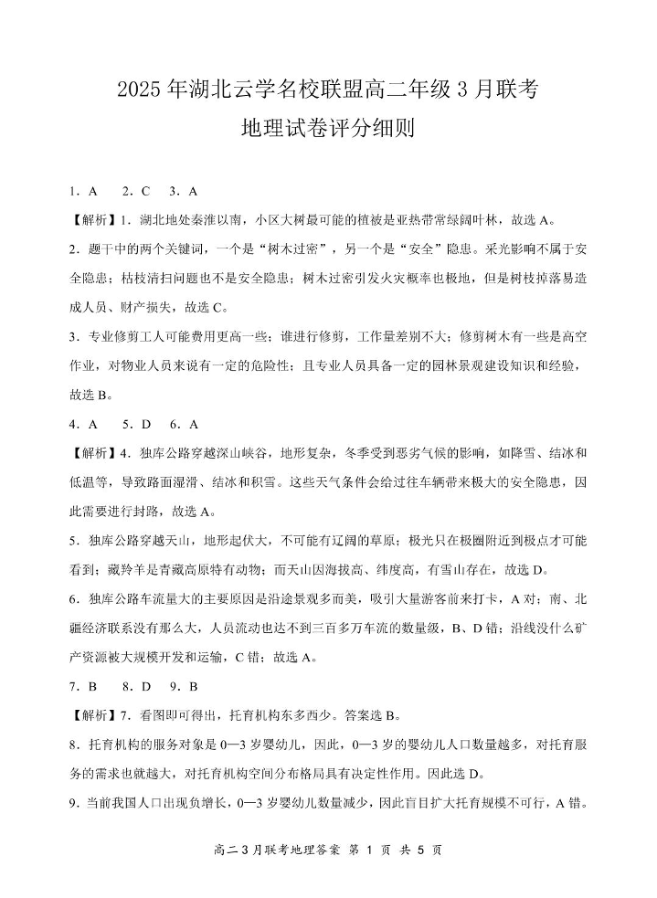 湖北省云学名校联盟2024-2025学年下学期3月高二联考地理答案