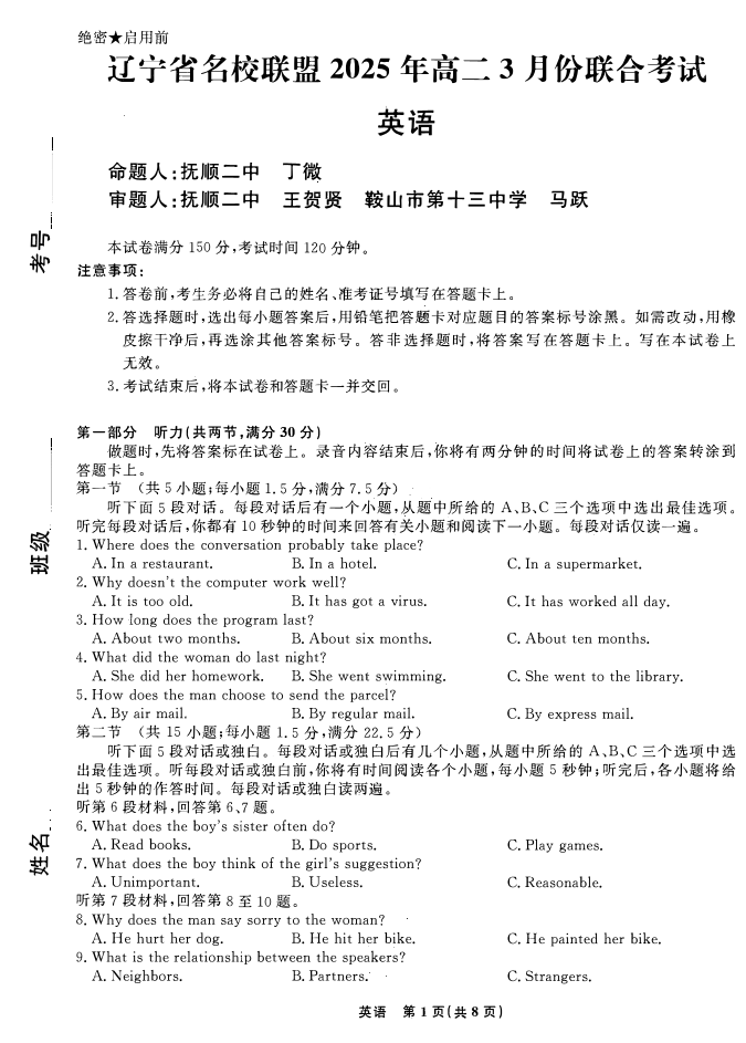 辽宁省名校联盟2024-2025学年下学期3月高二联合考试英语