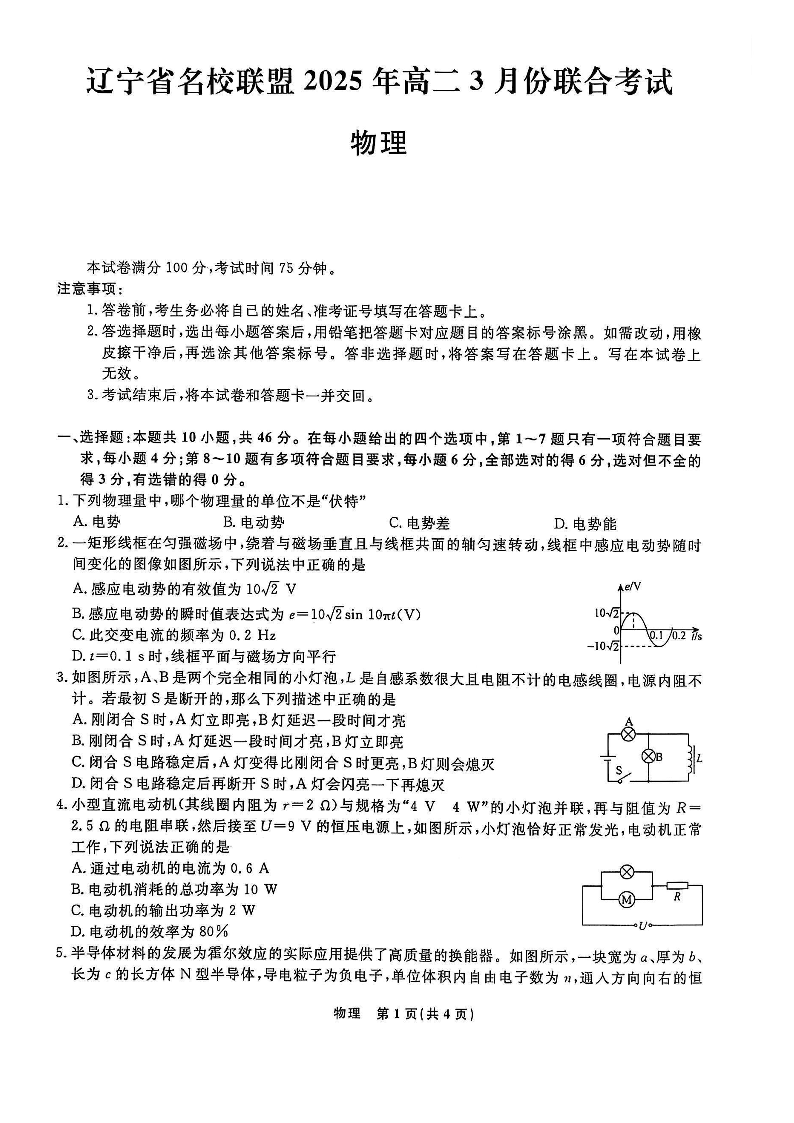 辽宁省名校联盟2024-2025学年下学期3月高二联合考试物理
