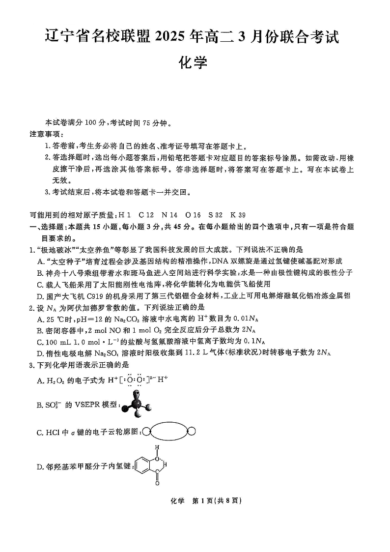 辽宁省名校联盟2024-2025学年下学期3月高二联合考试化学