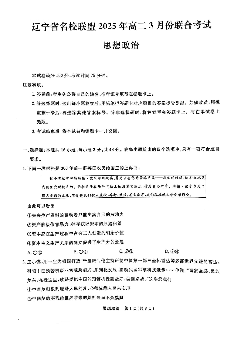 辽宁省名校联盟2024-2025学年下学期3月高二联合考试政治