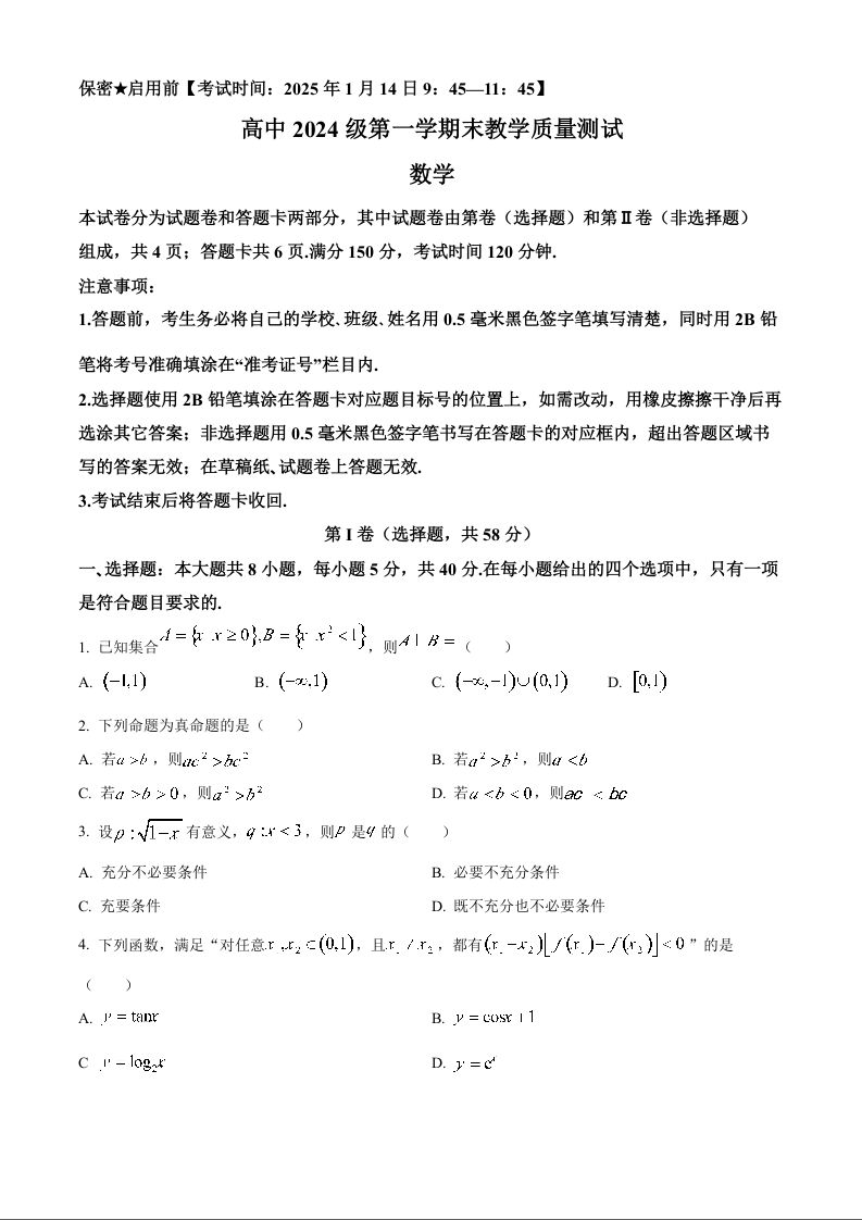 四川省绵阳市2024-2025学年上学期1月高一期末考试数学(原卷版)