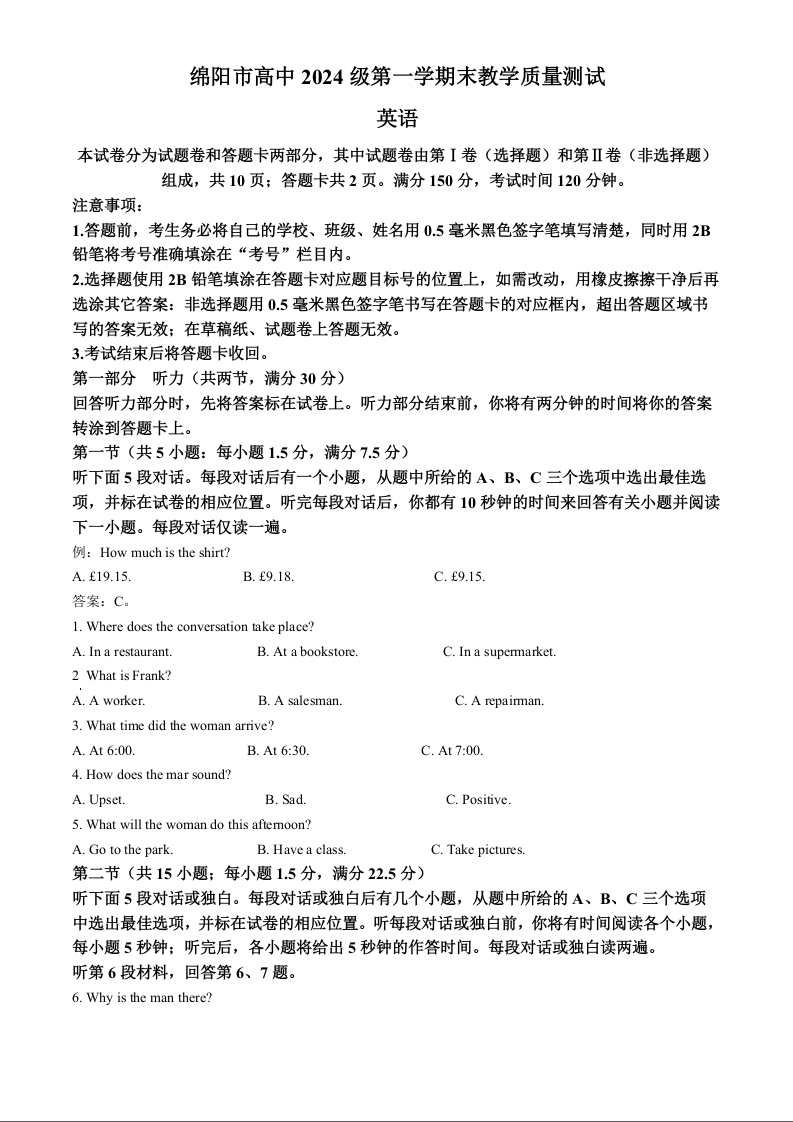 四川省绵阳市2024-2025学年上学期1月高一期末考试英语(解析版)