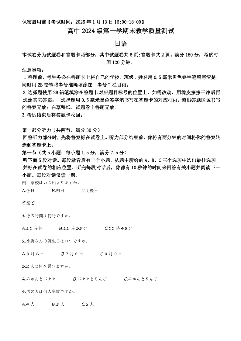 四川省绵阳市2024-2025学年上学期1月高一期末考试日语(解析版)