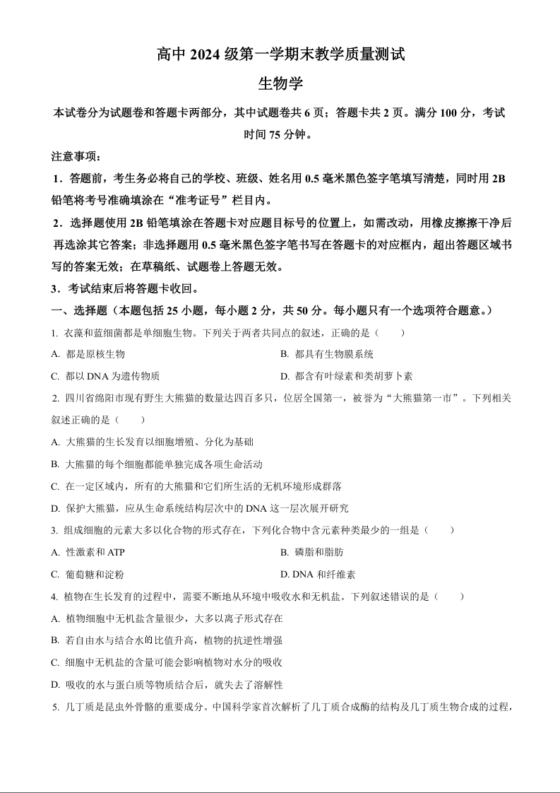 四川省绵阳市2024-2025学年上学期1月高一期末考试生物(原卷版)