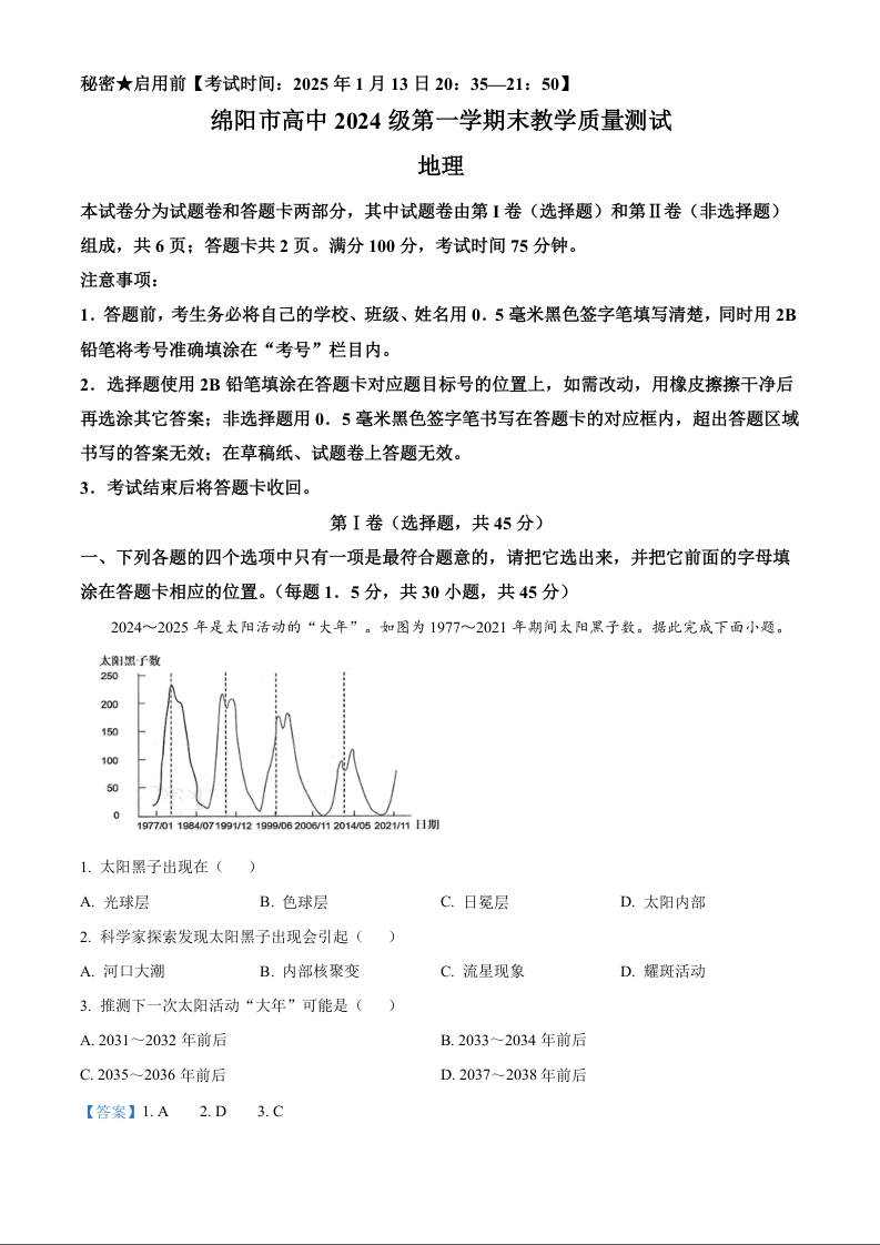 四川省绵阳市2024-2025学年上学期1月高一期末考试地理(解析版)