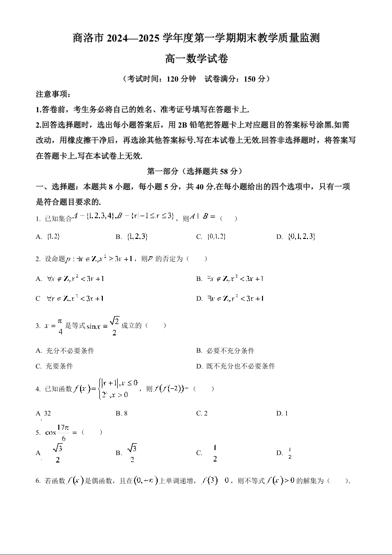 陕西省商洛市2024-2025学年上学期1月高一期末考试数学(原卷版)