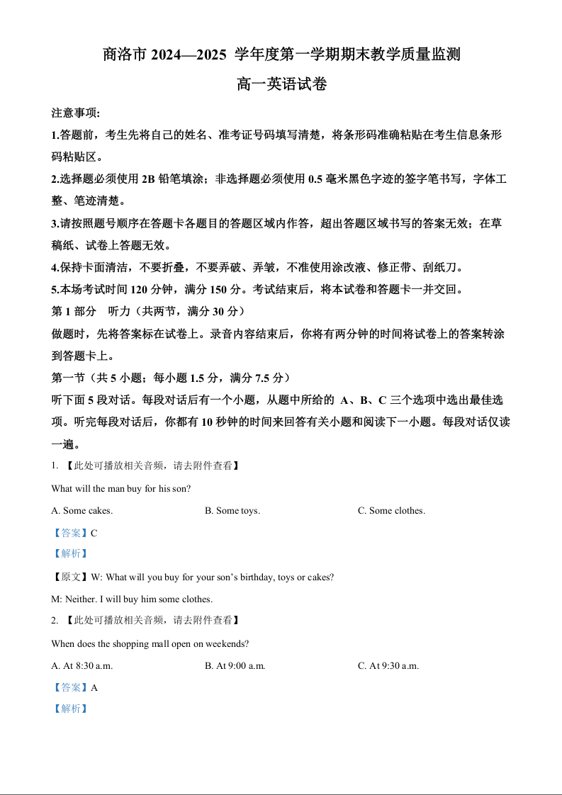 陕西省商洛市2024-2025学年上学期1月高一期末考试英语(解析版)