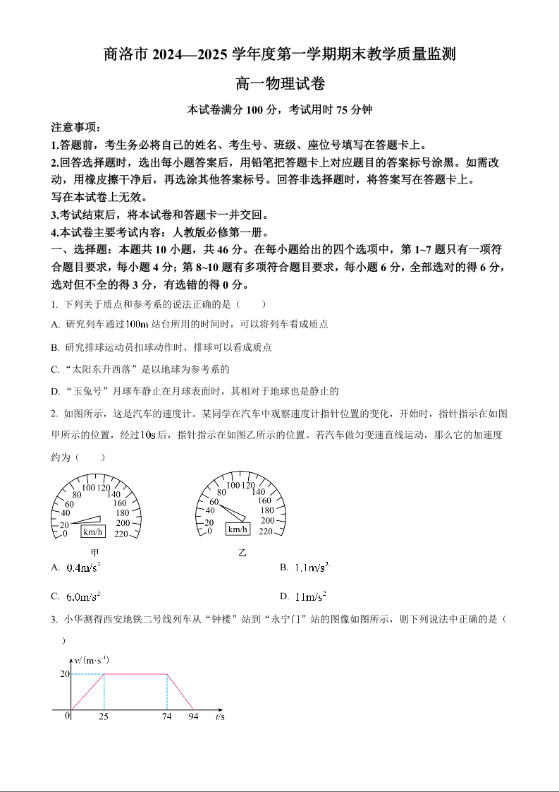 陕西省商洛市2024-2025学年上学期1月高一期末考试物理(原卷版)