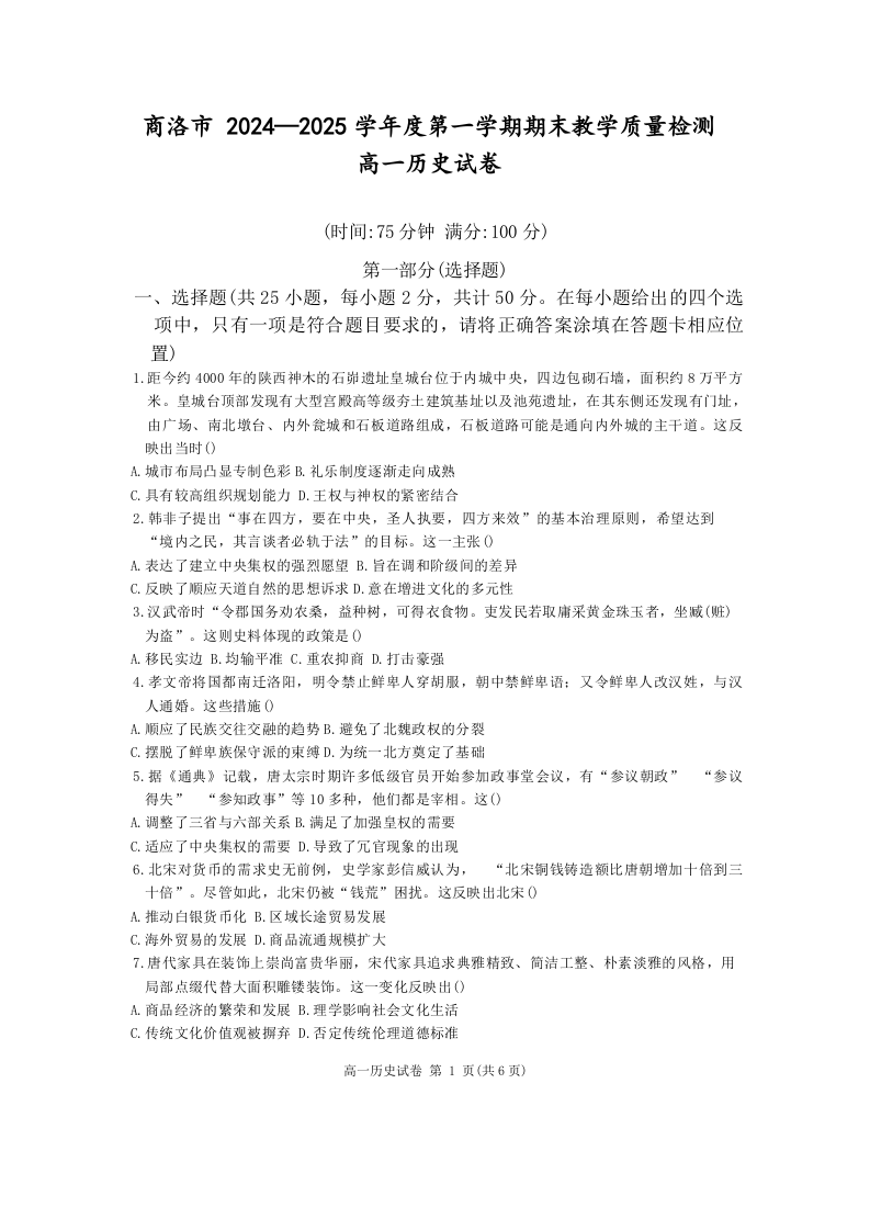 陕西省商洛市2024-2025学年上学期1月高一期末考试历史