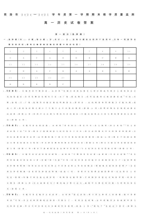 陕西省商洛市2024-2025学年上学期1月高一期末考试历史答案