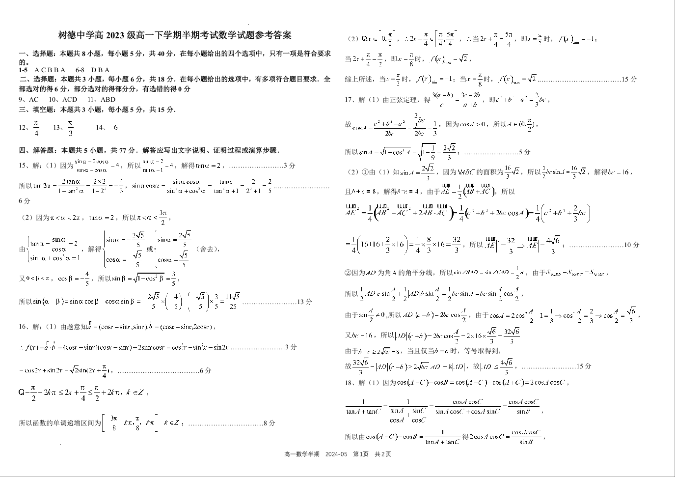四川省成都市树德中学2023-2024学年高一下学期5月期中考试数学答案