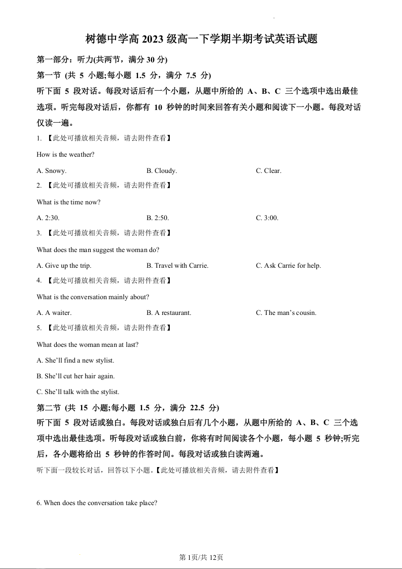 四川省成都市树德中学2023-2024学年高一下学期5月期中考试英语(原卷版)