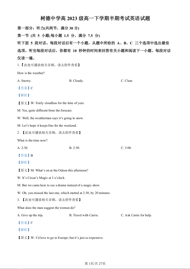四川省成都市树德中学2023-2024学年高一下学期5月期中考试英语(精品解析版)