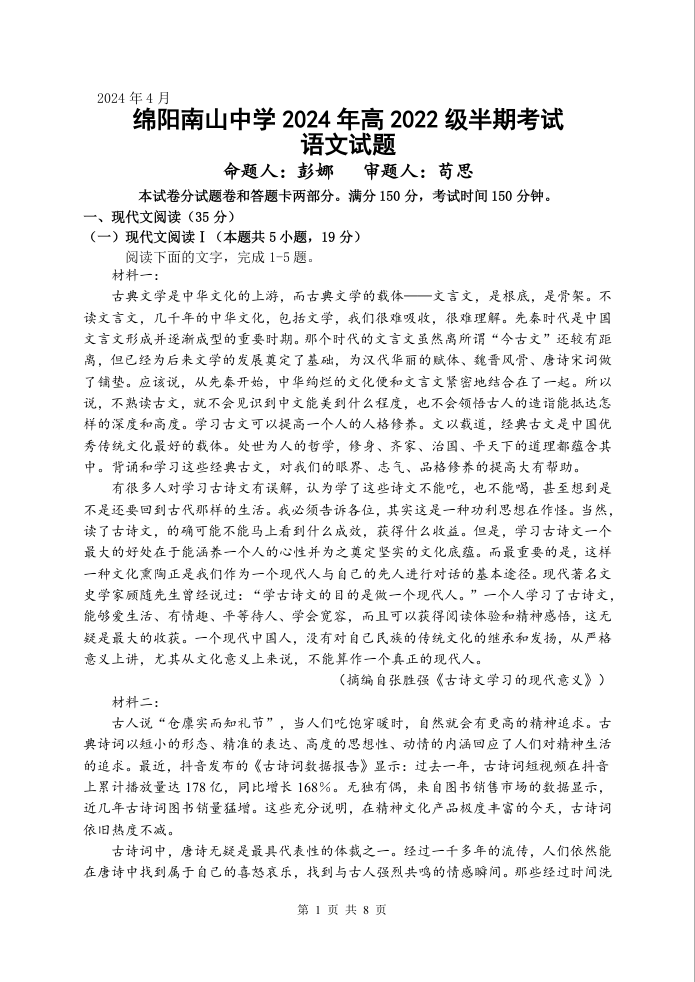 四川省绵阳市南山中学2023-2024学年高二下学期期中考试语文
