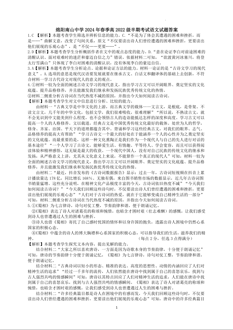 四川省绵阳市南山中学2023-2024学年高二下学期期中考试语文答案