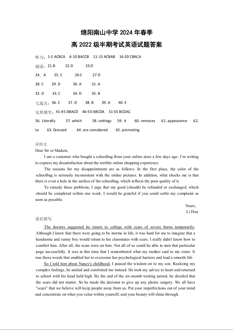 四川省绵阳市南山中学2023-2024学年高二下学期期中考试英语答案