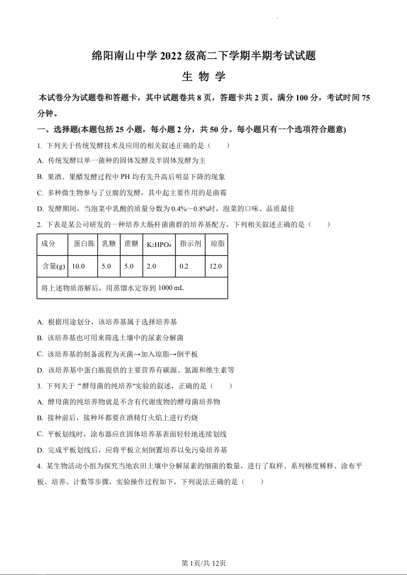 四川省绵阳市南山中学2023-2024学年高二下学期期中考试生物(原卷版)