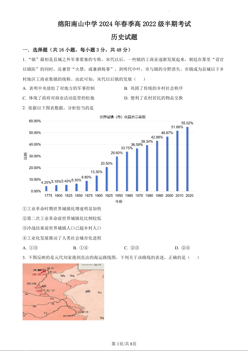 四川省绵阳市南山中学2023-2024学年高二下学期期中考试历史(原卷版)