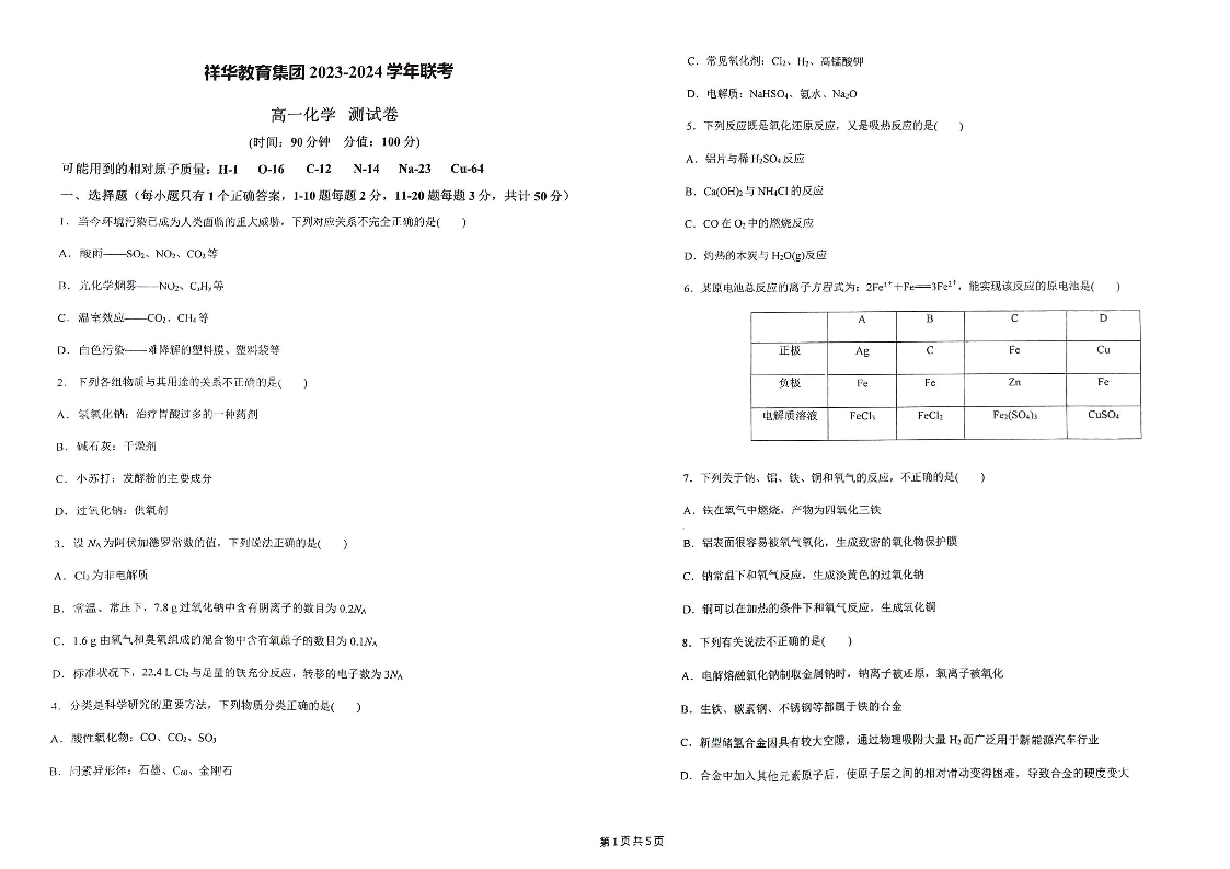 云南省四校联考2023-2024学年高一下学期5月月考化学
