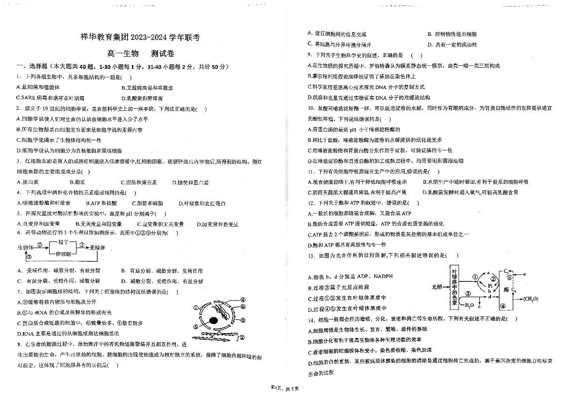 云南省四校联考2023-2024学年高一下学期5月月考生物