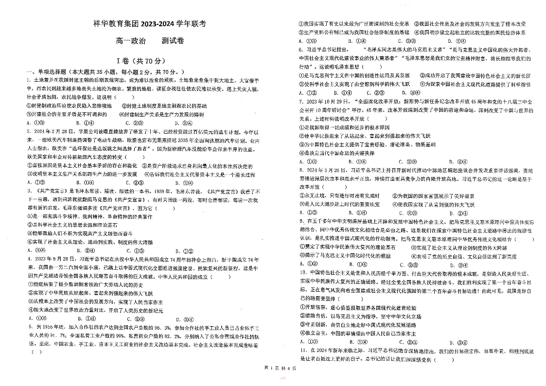云南省四校联考2023-2024学年高一下学期5月月考政治