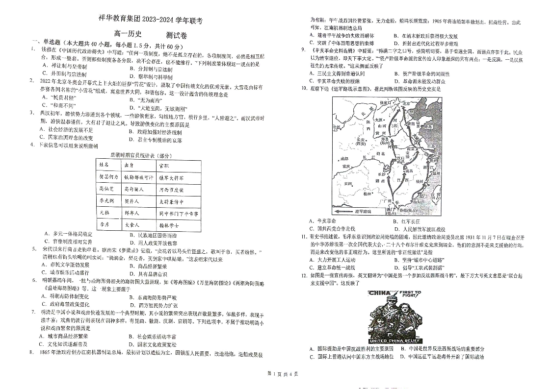 云南省四校联考2023-2024学年高一下学期5月月考历史+答案