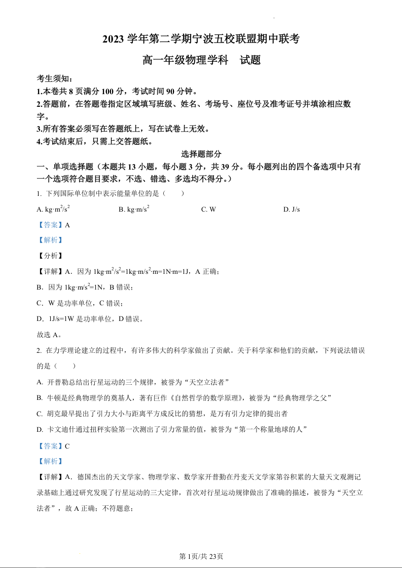 浙江省宁波五校联盟2023-2024学年高一下学期期中联考物理(精品解析版)