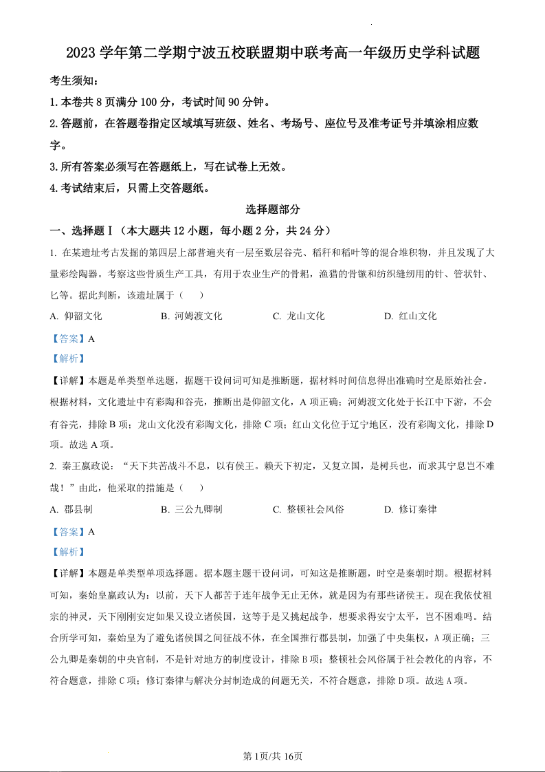 浙江省宁波五校联盟2023-2024学年高一下学期期中联考历史(精品解析版)
