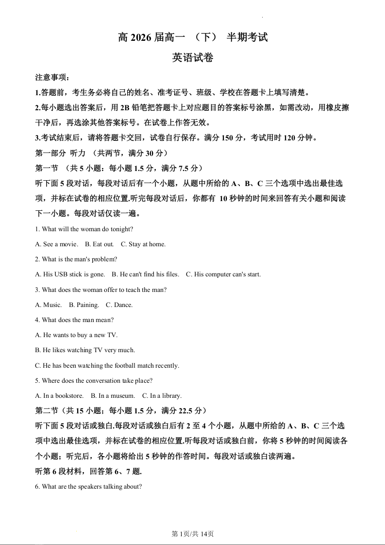 重庆市巴蜀中学校2023-2024学年高一下学期5月期中考试英语(原卷版)
