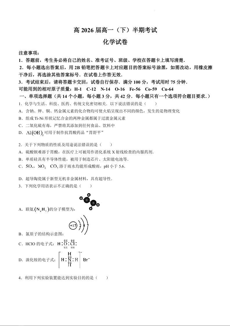 重庆市巴蜀中学校2023-2024学年高一下学期5月期中考试化学+答案
