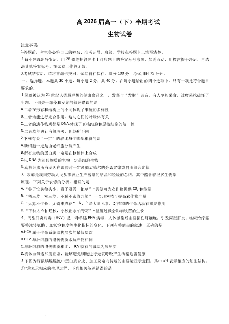 重庆市巴蜀中学校2023-2024学年高一下学期5月期中考试生物+答案