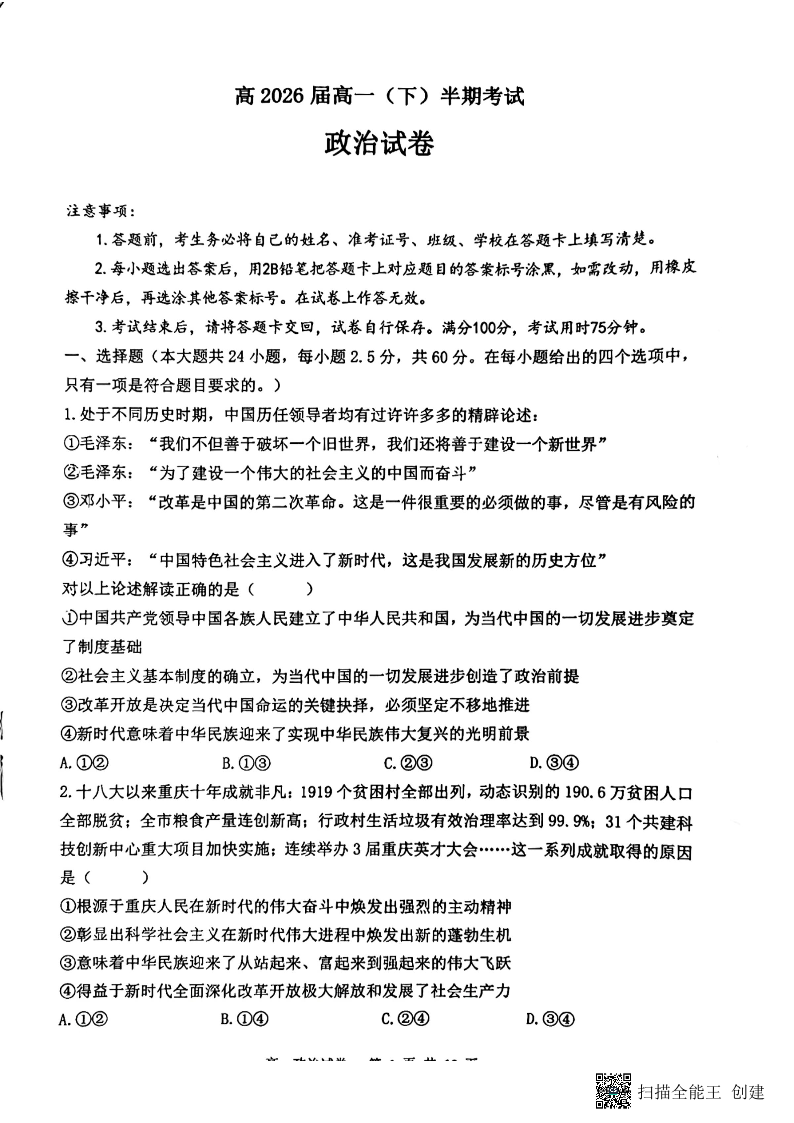 重庆市巴蜀中学校2023-2024学年高一下学期5月期中考试政治