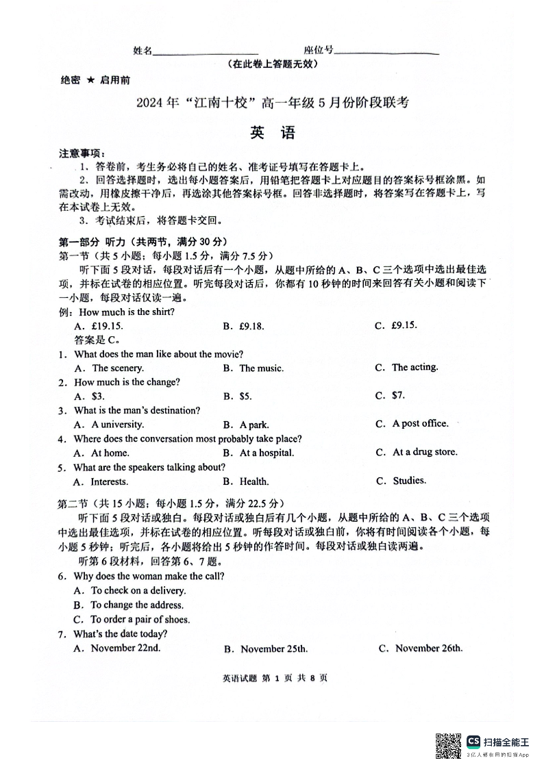 安徽省江南十校2023—2024学年高一下学期5月份阶段联考英语