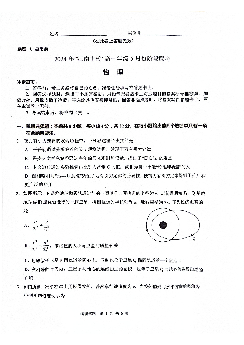 安徽省江南十校2023—2024学年高一下学期5月份阶段联考物理