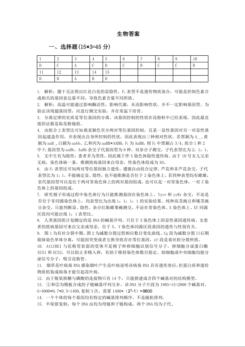 安徽省江南十校2023—2024学年高一下学期5月份阶段联考生物答案