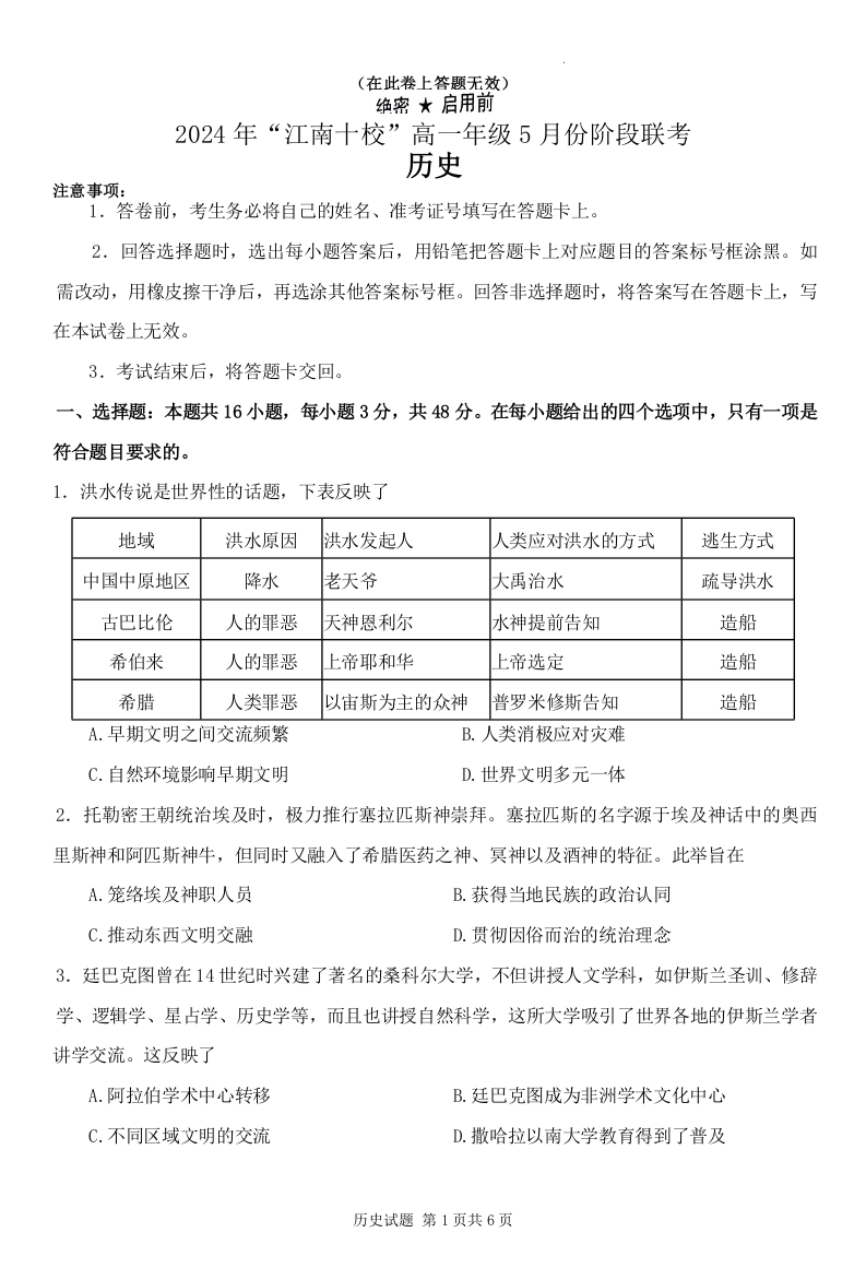 安徽省江南十校2023—2024学年高一下学期5月份阶段联考历史