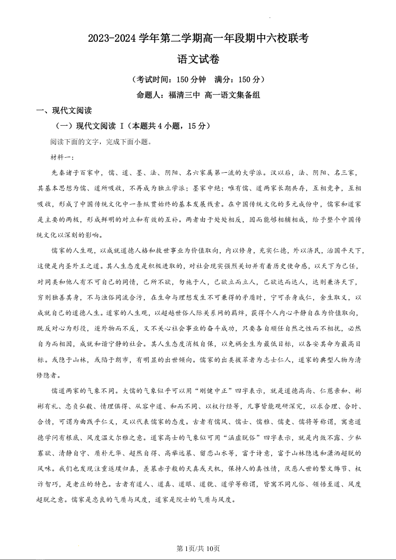 福建省福州市六校联考2023-2024学年高一下学期期中联考语文(原卷版)