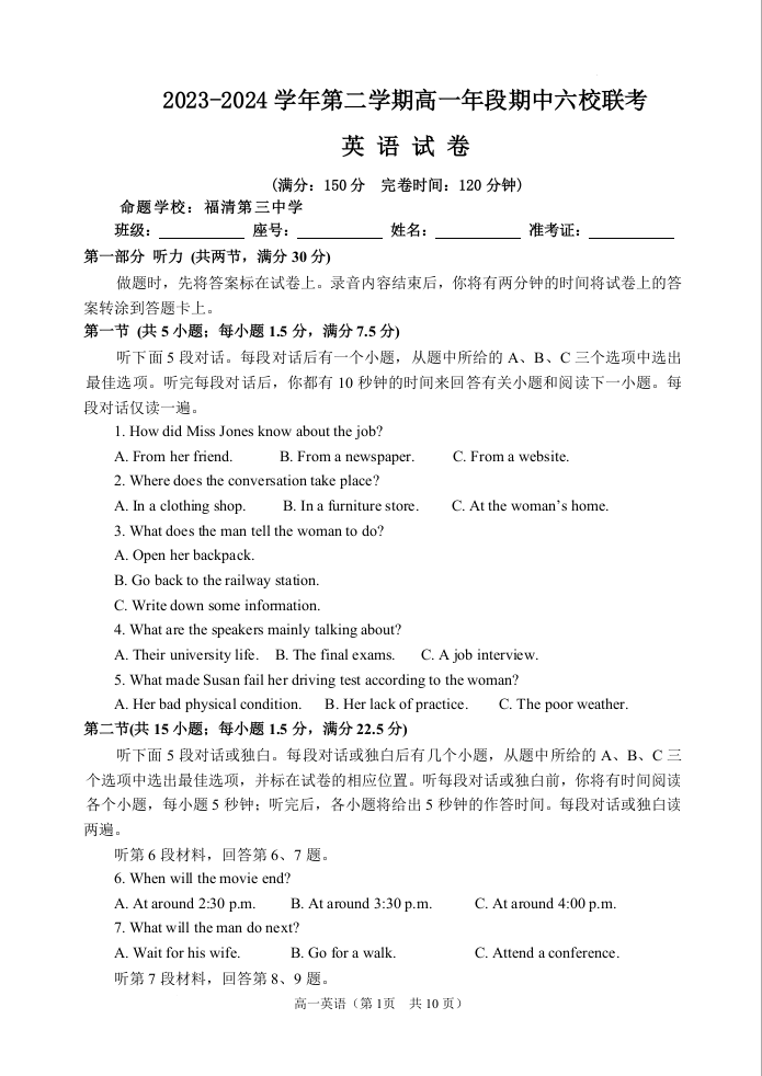 福建省福州市六校联考2023-2024学年高一下学期期中联考英语